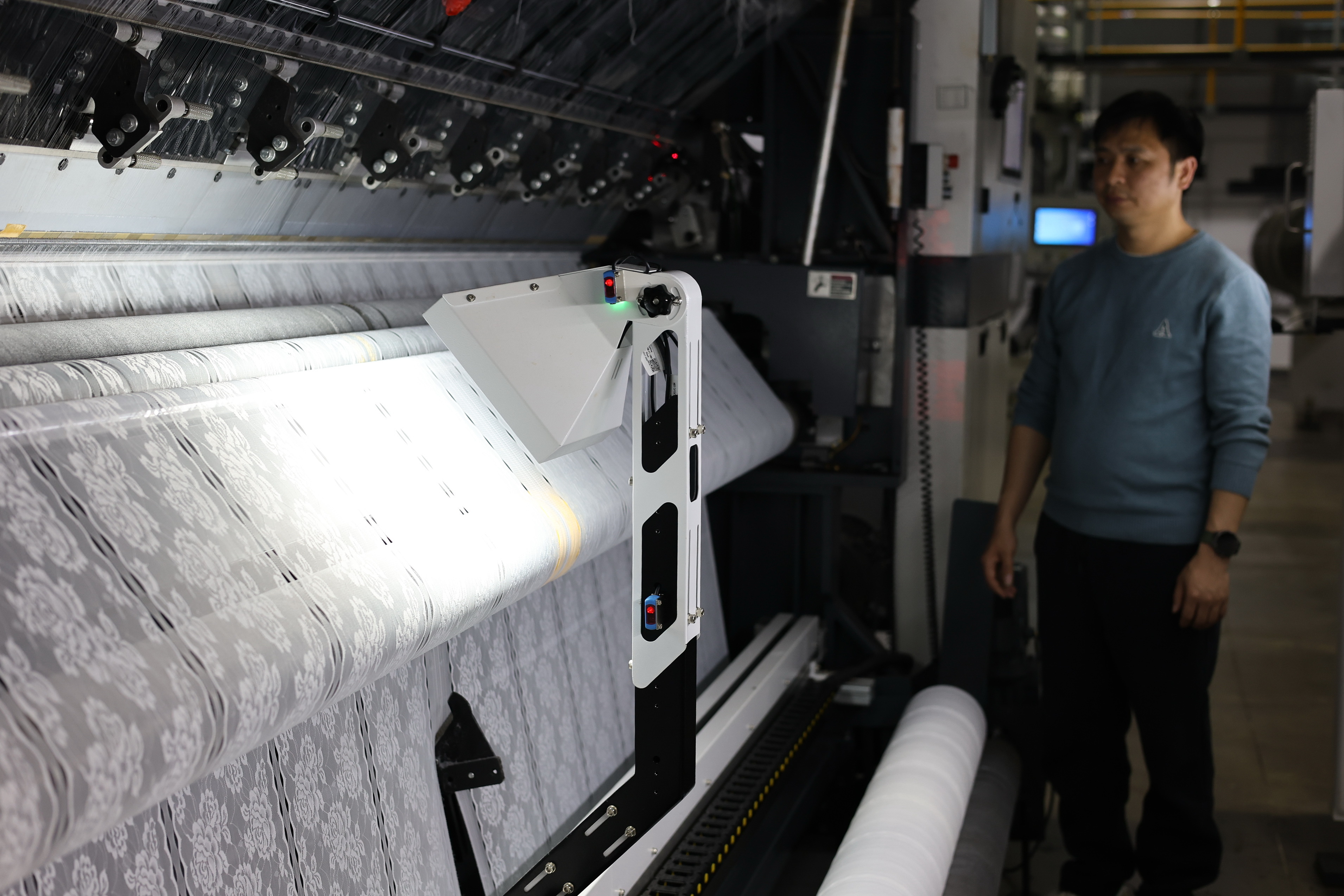 长乐区辅布司产业园纺织车间里,机器轰鸣声中,AI智能检测设备上的高清录像头,正在对蕾丝花边产物“查看”拍照,影像上传到系统后台,算法自动比对,在限制面板上及时生成质地热力争,一朝发现产物出现破洞、断纱、偏针等问题,就会自动“停机”。
