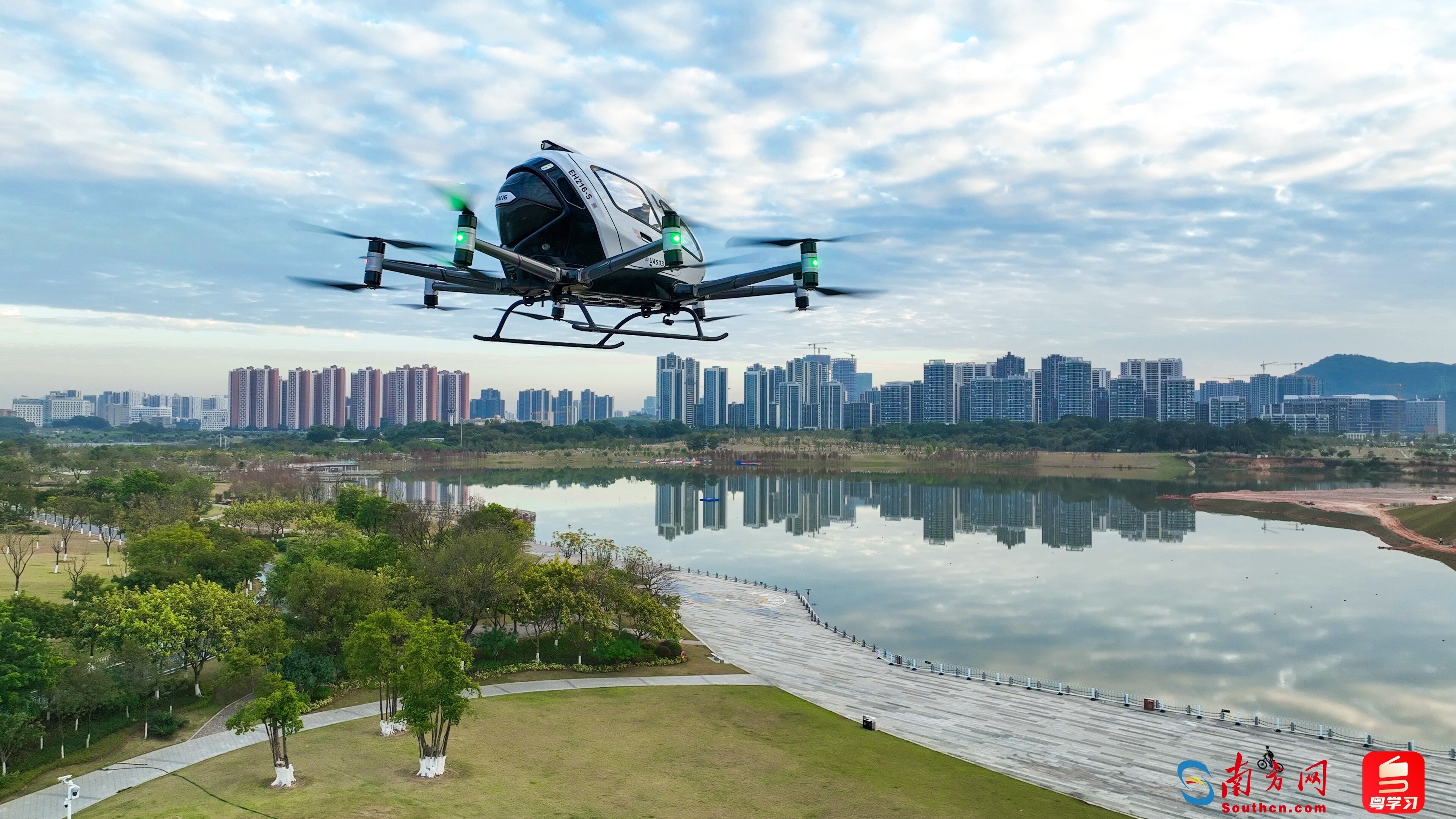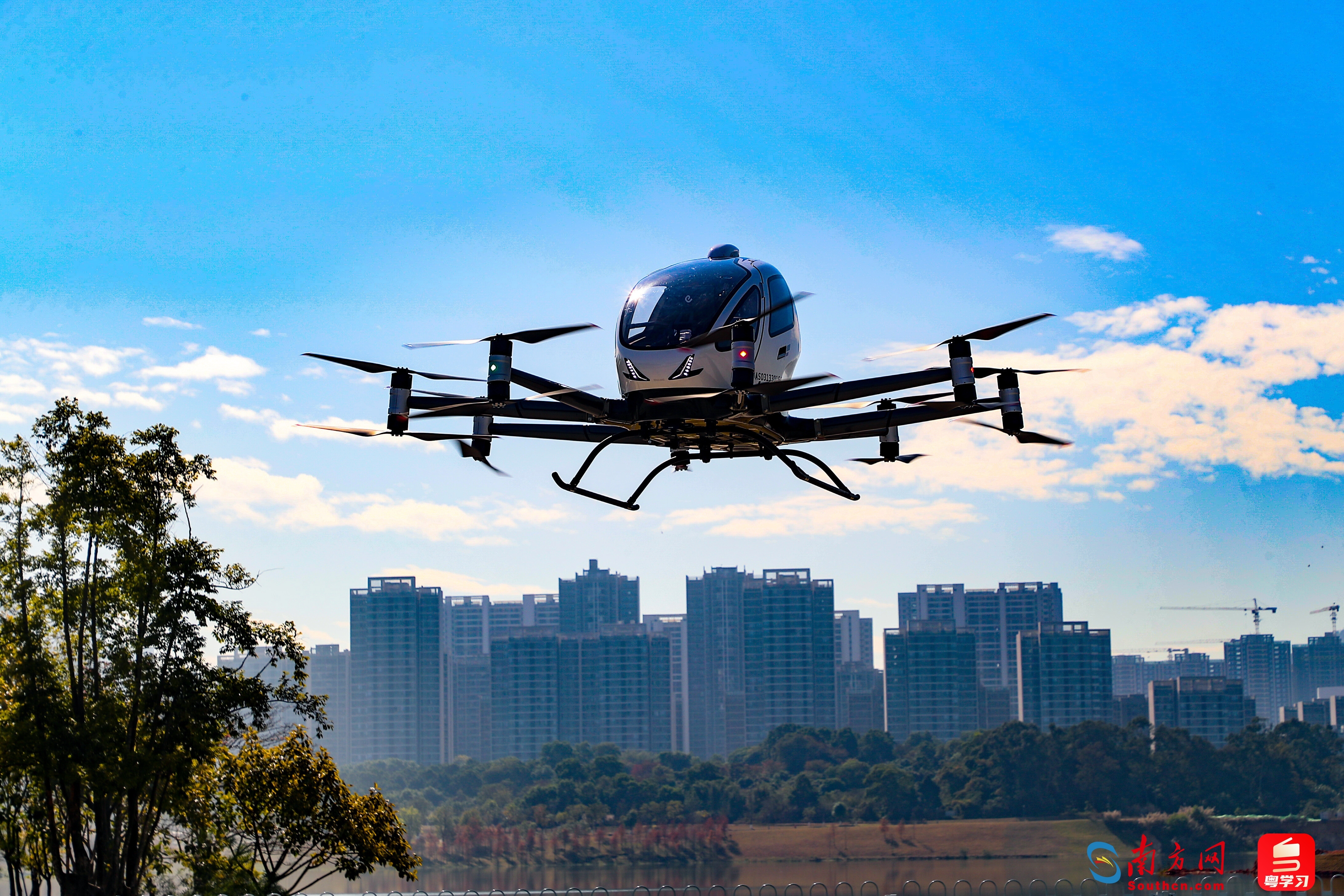 亿航智能无东说念主驾驶载东说念主航空器在中新广州学问城九龙湖广场上空遨游。