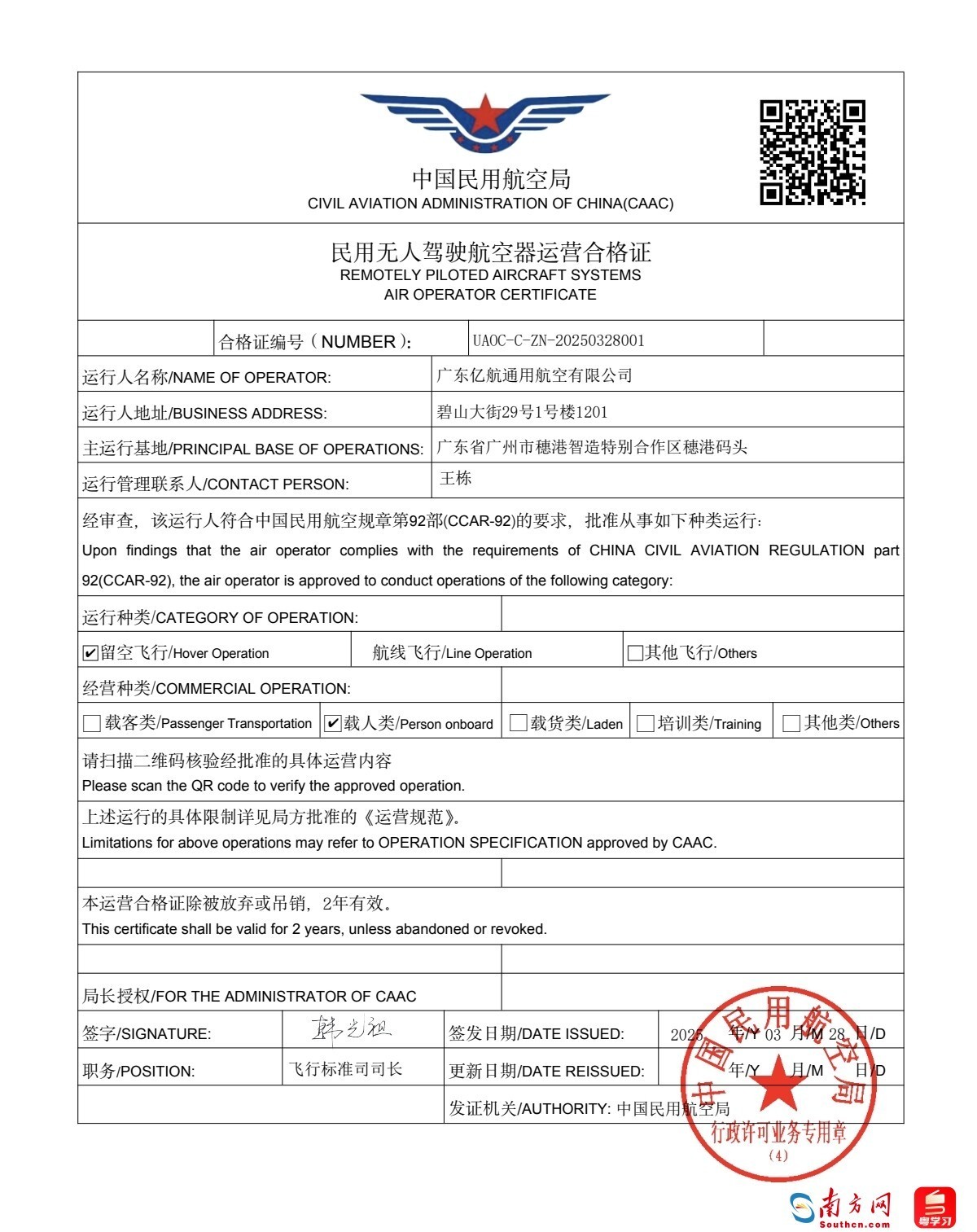 3月28日亿航智能旗下全资子公司广东亿航通用航空有限公司赢得各人首张民用无东说念主驾驶载东说念主航空器运营及格证(Operation Certificate,简称OC)。OC是民航局向运营商颁发的禀赋阐明,象征着企业具备安全、合规开展生意遨游的能力。若将低空经济比作“造车”,适航三证(TC/PC/AC)处置了“车能造”的问题,OC则决定了“车能动身”。