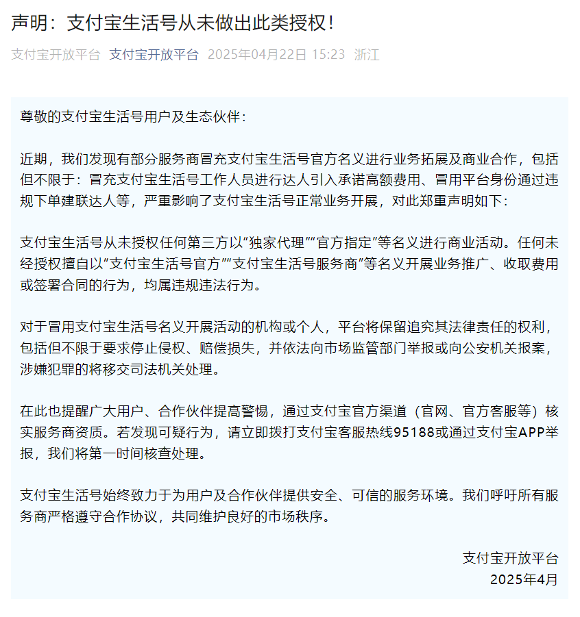 近期,发现存部分做事商冒充支付宝生计号官方形式进行业务拓展及贸易劝诱。