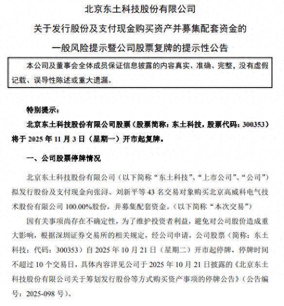 本次往返展望组成紧要钞票重组。公司股票将于2025年11月3日复牌。