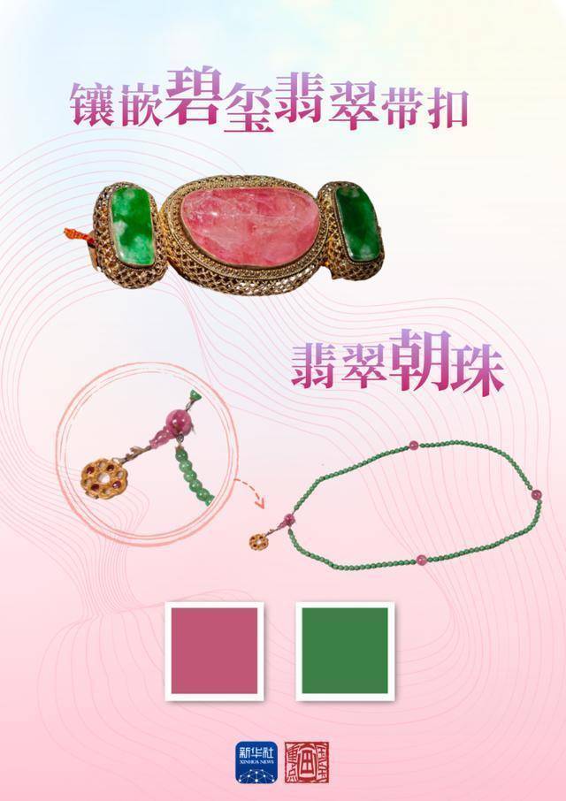 嵌入碧玺翡翠带扣,带扣聘用鎏金、花丝嵌入等技法,嵌入碧玺和翡翠而成,作念工精细、用料虚耗、配色扫视。