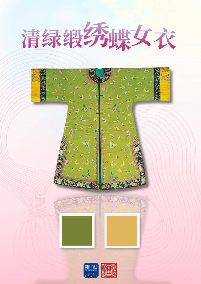 直袖、对襟、圆领,这件清绿缎绣蝶女衣聘用绿缎面料,袖口、领边及衣襟下摆镶黑缎边,袖口又接一段黄绸边,崭新典雅。