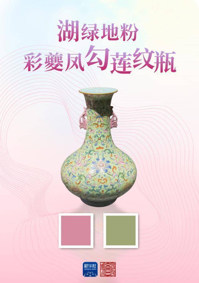 湖绿地粉彩夔凤勾莲纹瓶,瓶身遮挡淡绿地粉彩,口沿内壁和圈足内罩湖绿釉,勾莲纹居中,双夔凤纹立于两侧,颜色丰富而柔柔。